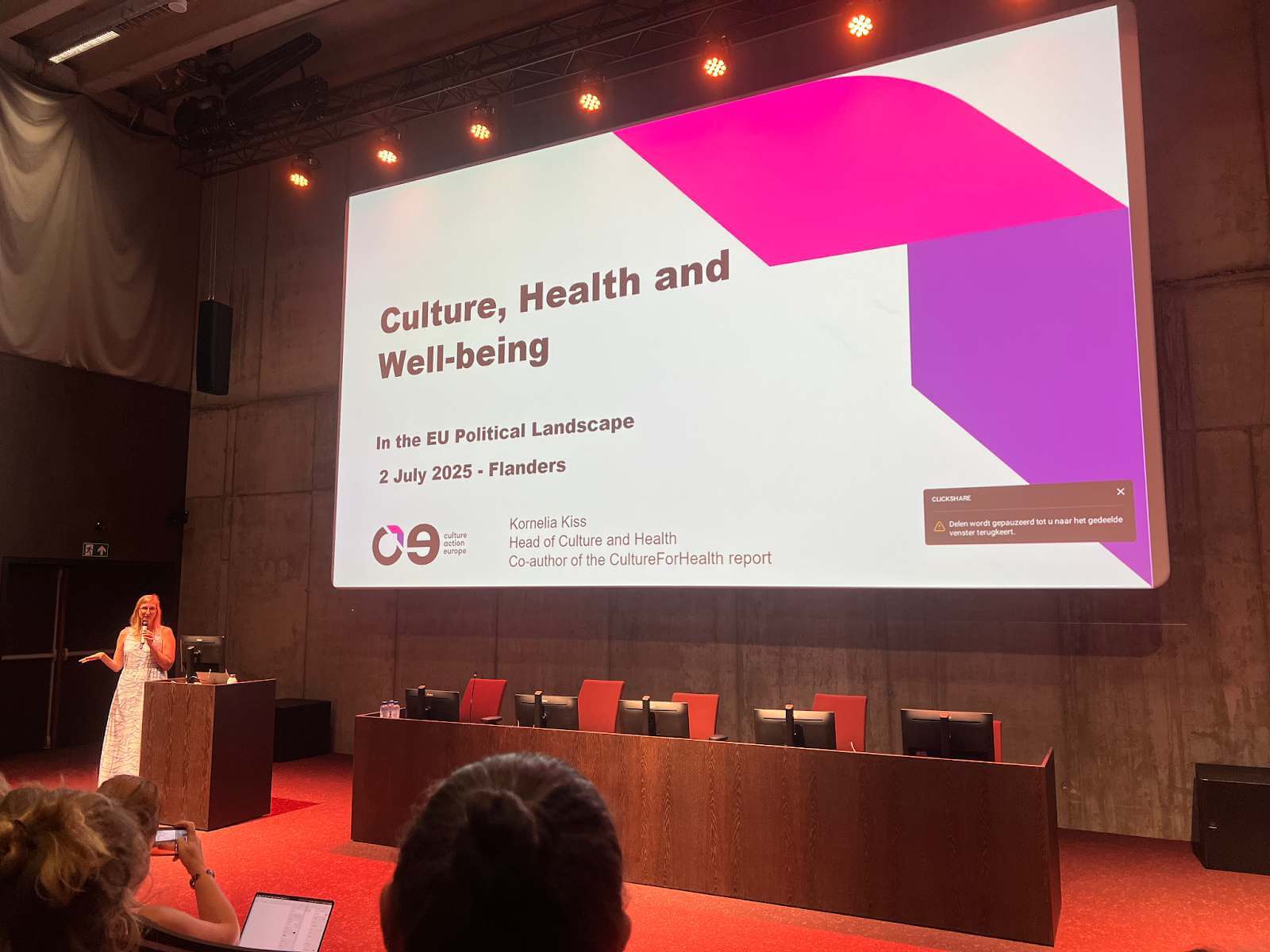 The event opened with a welcome speech by Caroline Gennez, Flemish Minister for Wellbeing and Culture. She underlined her commitment to strengthening the ties between both sectors through concrete policy measures. To anchor this collaboration structurally, a new policy line will be developed, and a dedicated coordinator has already been appointed to actively build bridges between culture and health. The Minister stressed that the connection between cultural education and cultural wellbeing must be secured for the long term, capturing her vision with the statement: “Wellbeing is culture and culture is wellbeing.”